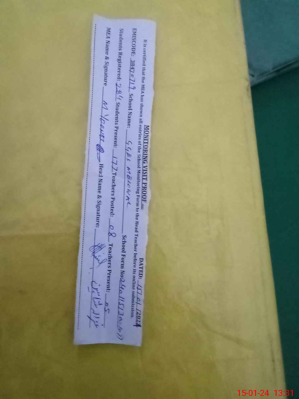 | Attendance Register | Head Teacher | MEA with School | Visit Proof |