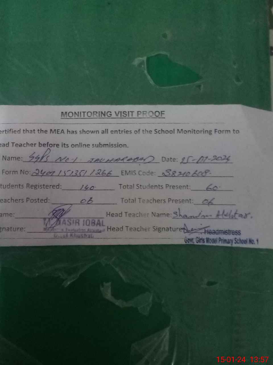 | Attendance Register | Head Teacher | MEA with School | Visit Proof |
