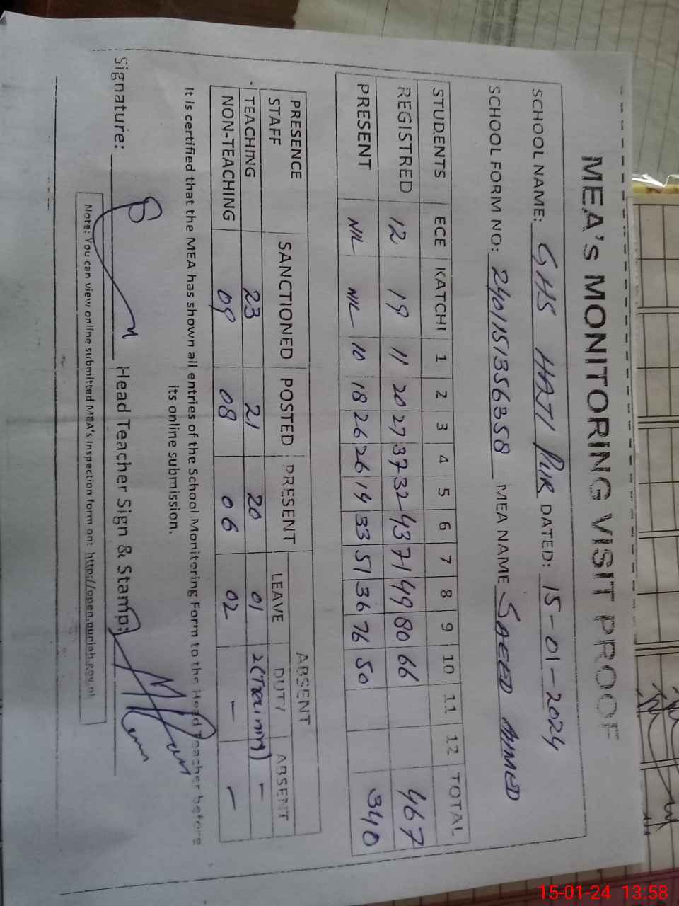 | Attendance Register | Head Teacher | MEA with School | Visit Proof |