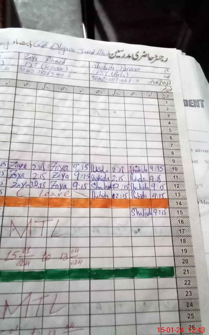 | CNIC | Full Name | Designation | R/C | Absence During Last Calender Month |