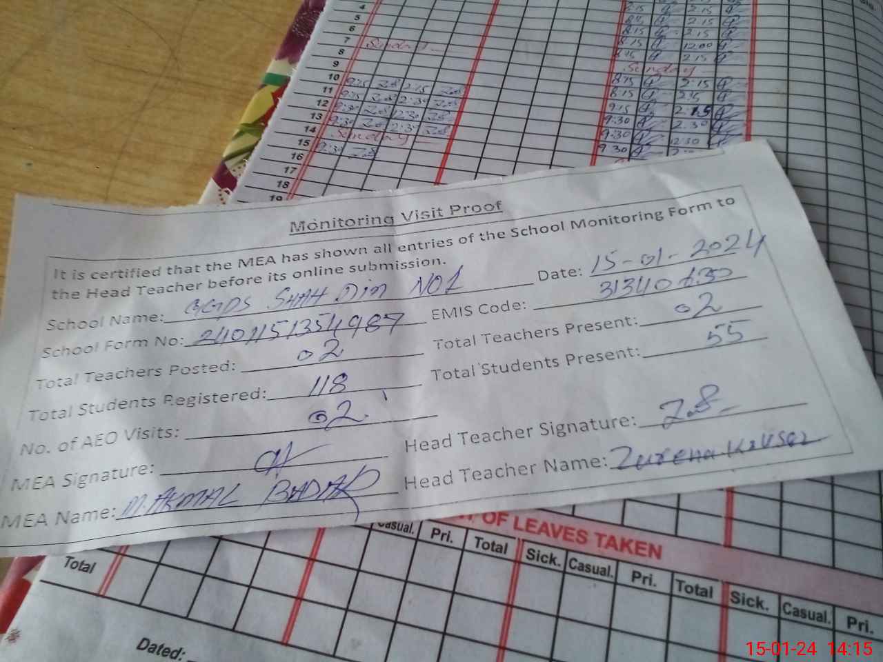 | Attendance Register | Head Teacher | MEA with School | Visit Proof |