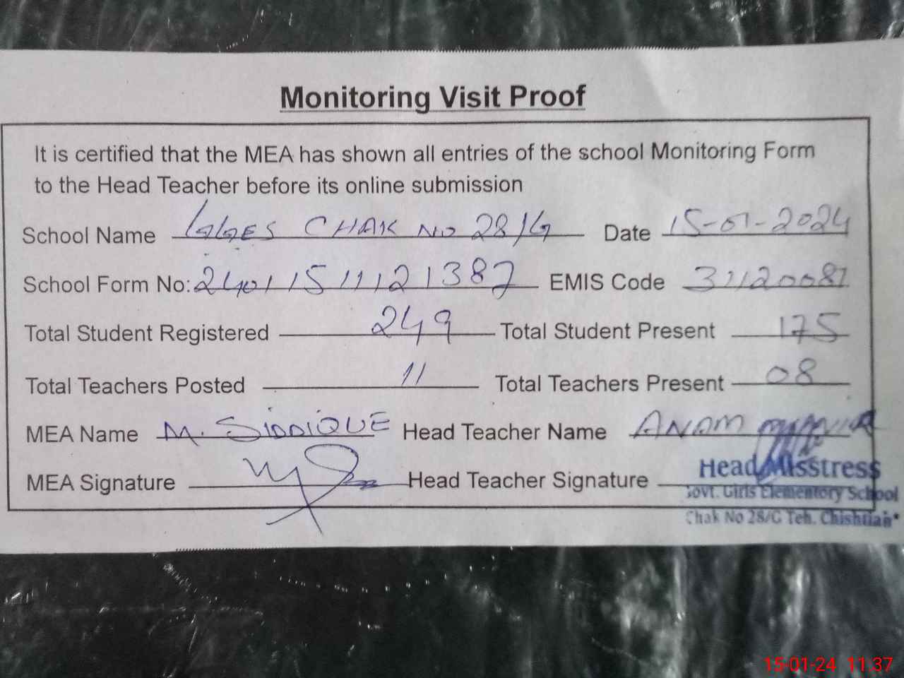 | Attendance Register | Head Teacher | MEA with School | Visit Proof |