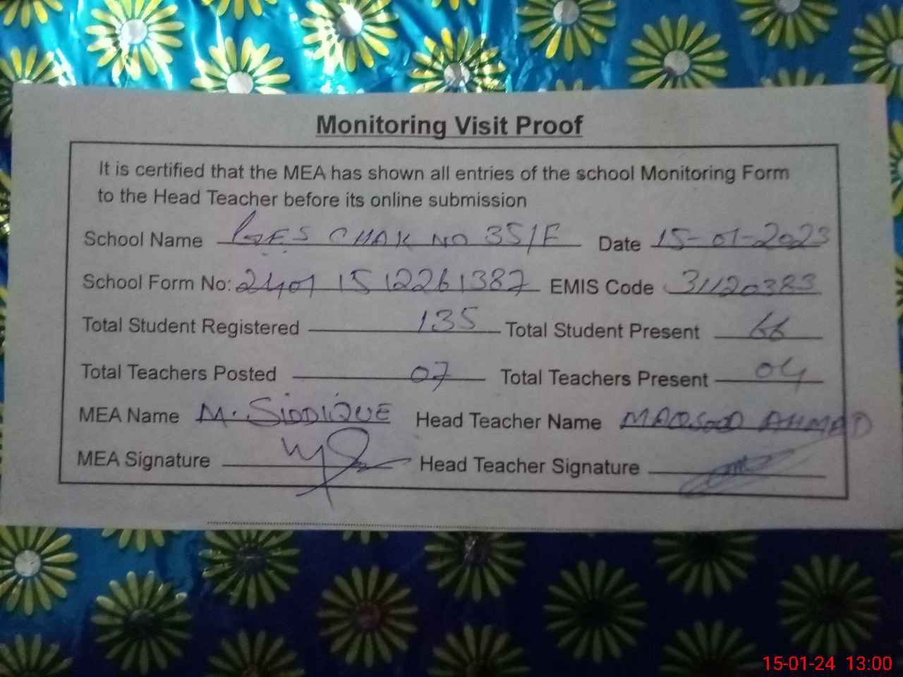 | Attendance Register | Head Teacher | MEA with School | Visit Proof |
