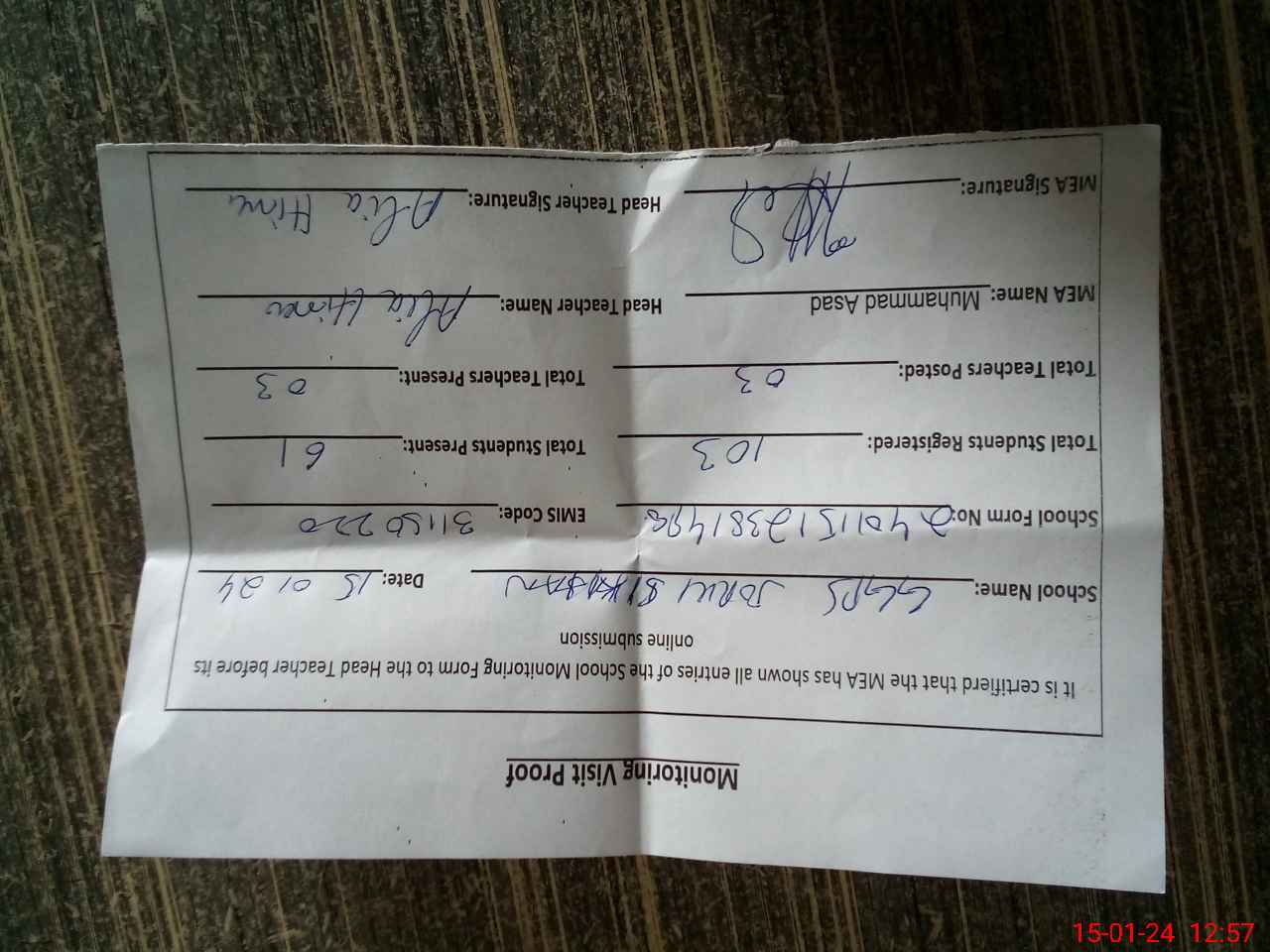 | Attendance Register | Head Teacher | MEA with School | Visit Proof |