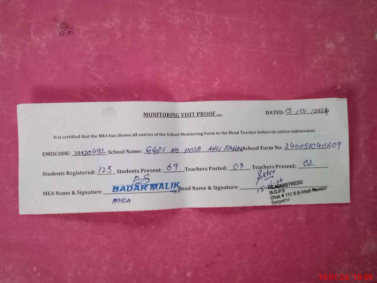 | Attendance Register | Head Teacher | MEA with School | Visit Proof |