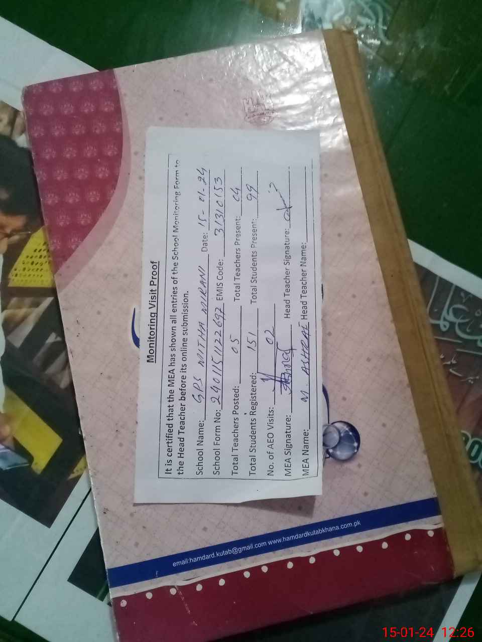| Attendance Register | Head Teacher | MEA with School | Visit Proof |
