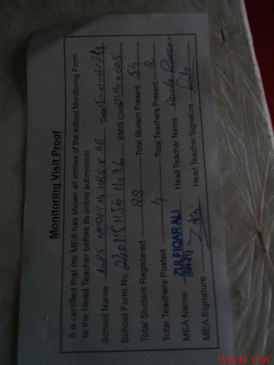 | Attendance Register | Head Teacher | MEA with School | Visit Proof |