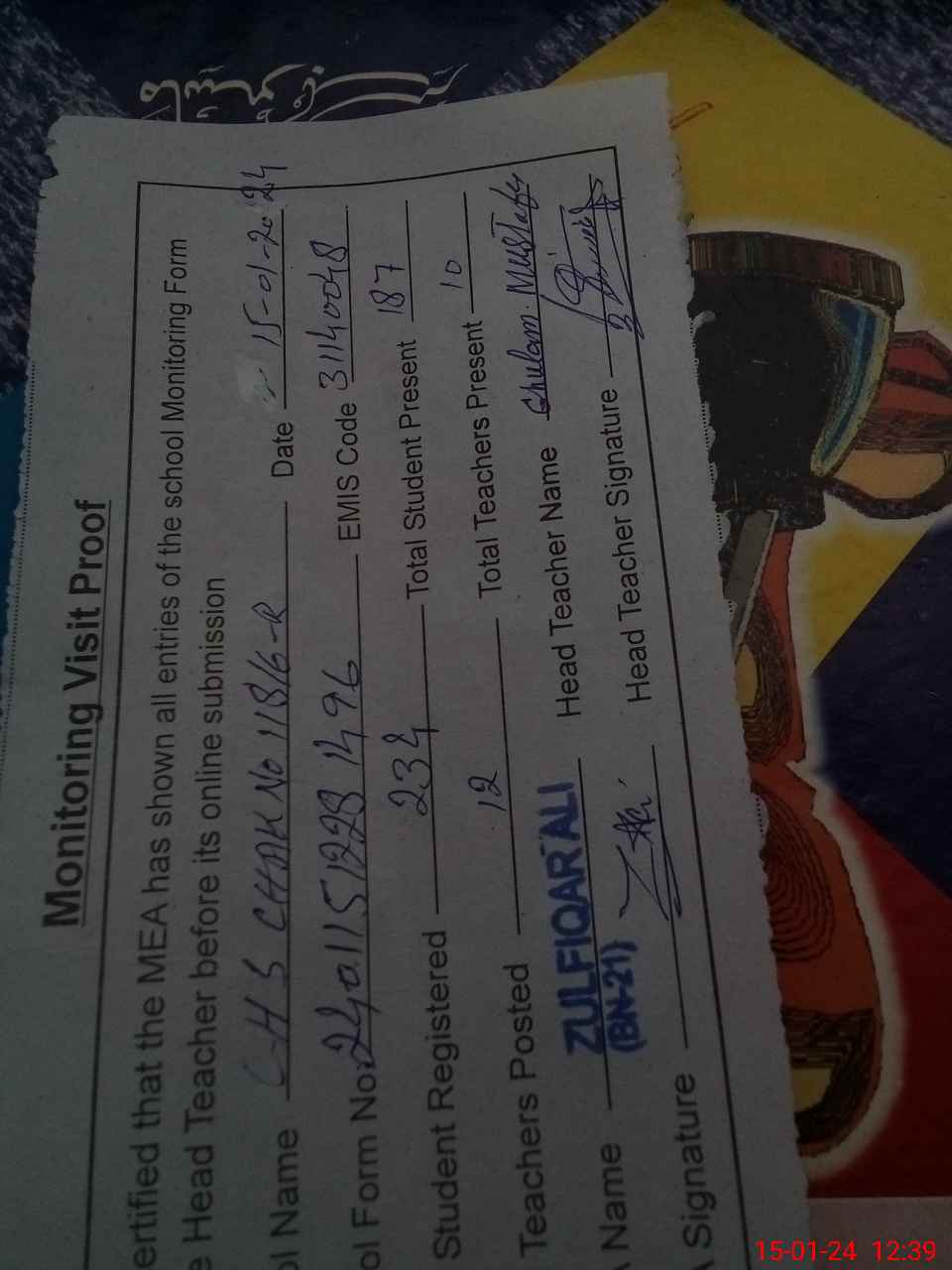 | Attendance Register | Head Teacher | MEA with School | Visit Proof |