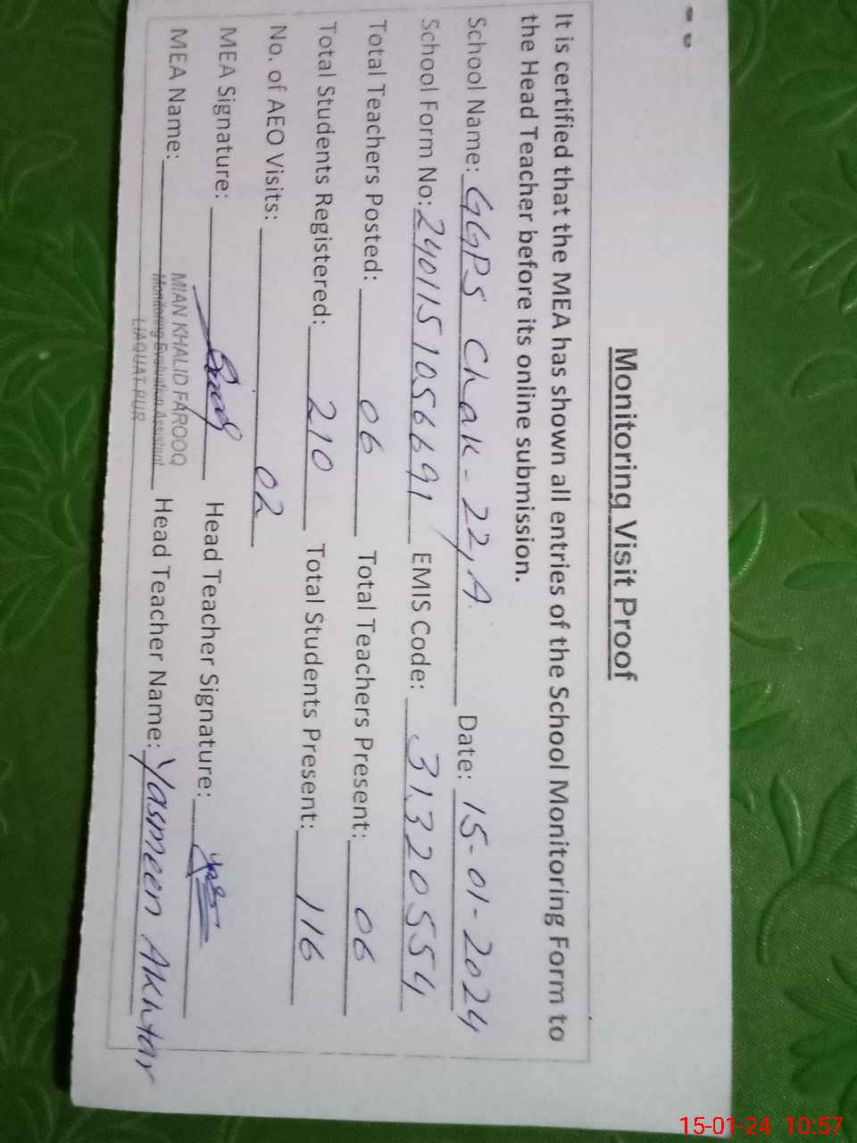 | EMIS Code: 31320554 | Name of School: GGPS CHAK NO 22/A | |||