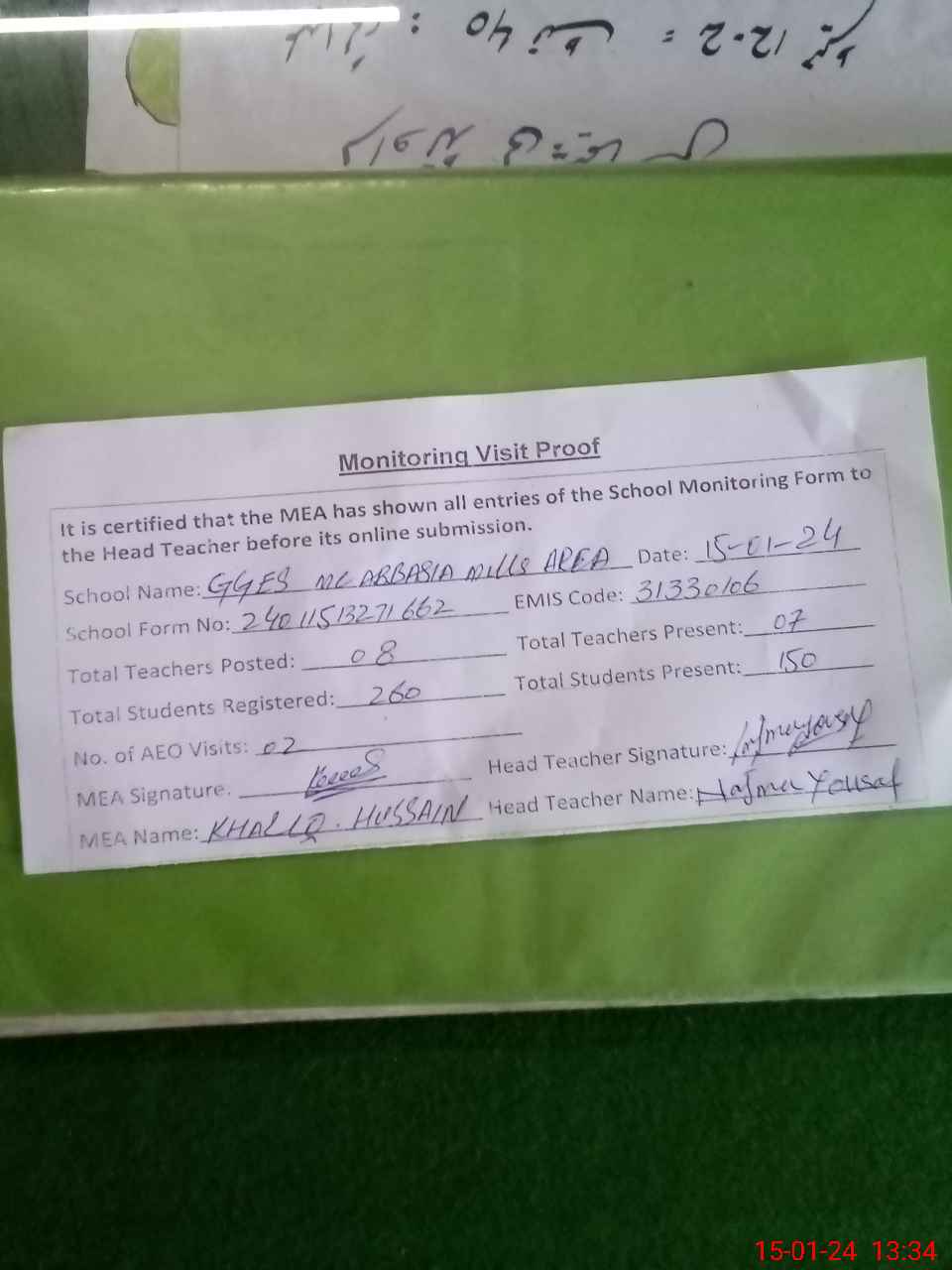 | Certified that this School was Inspected by the Undersigned MEA/DMO Today and the Information Stated Above is as Per Record. | |||||
