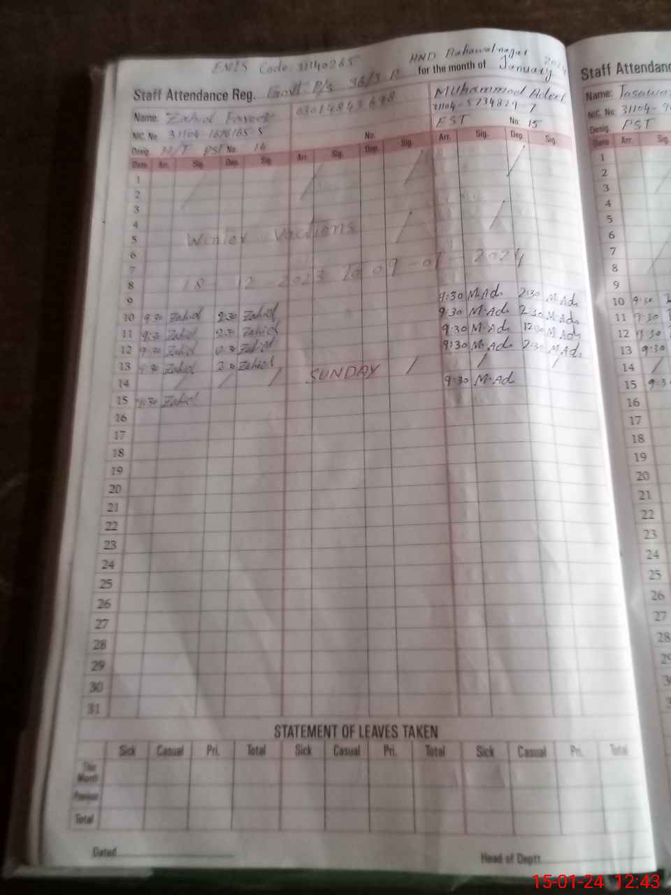 | Name: Za**** Fa**** Designation: (School Headmaster's/Headmistress's) PST Phone/Cell Number: 03**** |