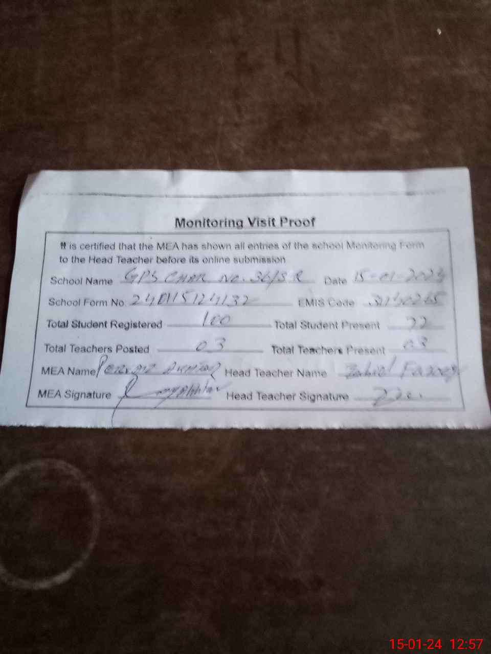 | Attendance Register | Head Teacher | MEA with School | Visit Proof |