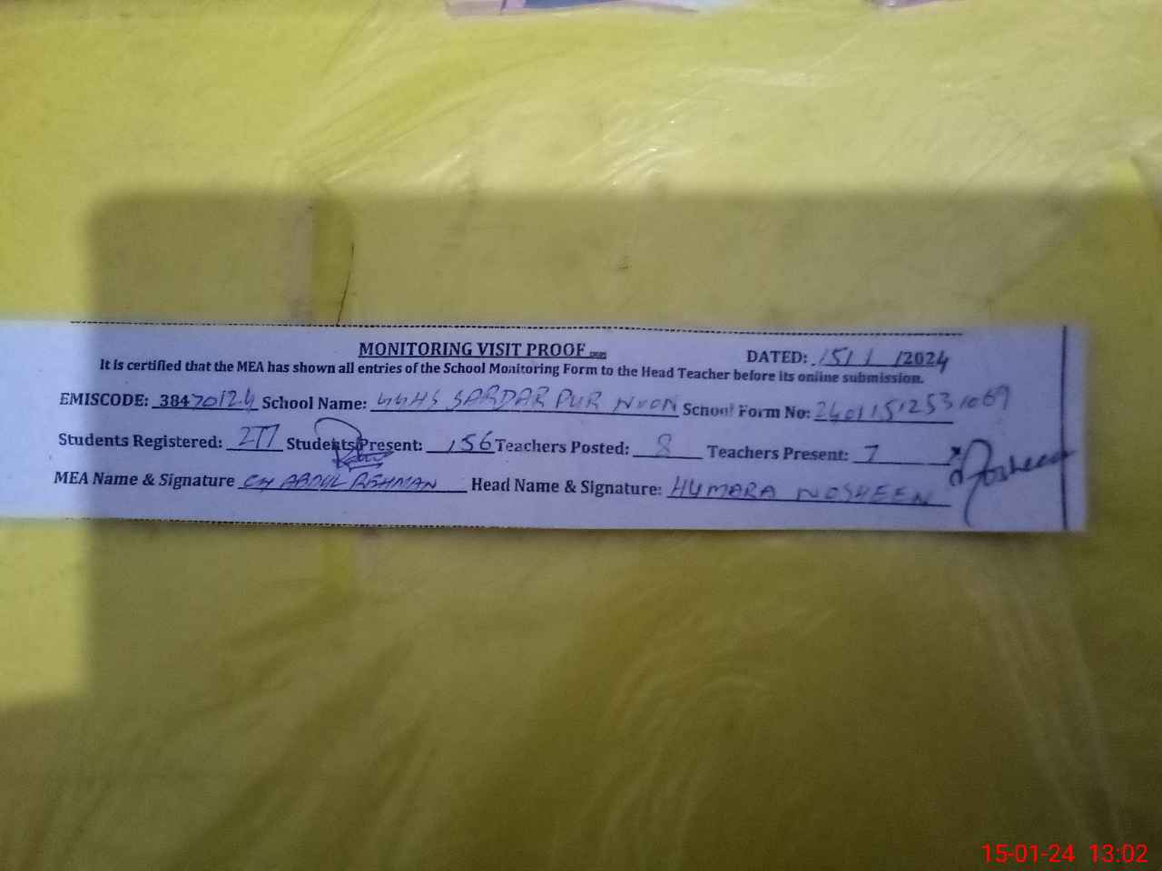 | Attendance Register | Head Teacher | MEA with School | Visit Proof |