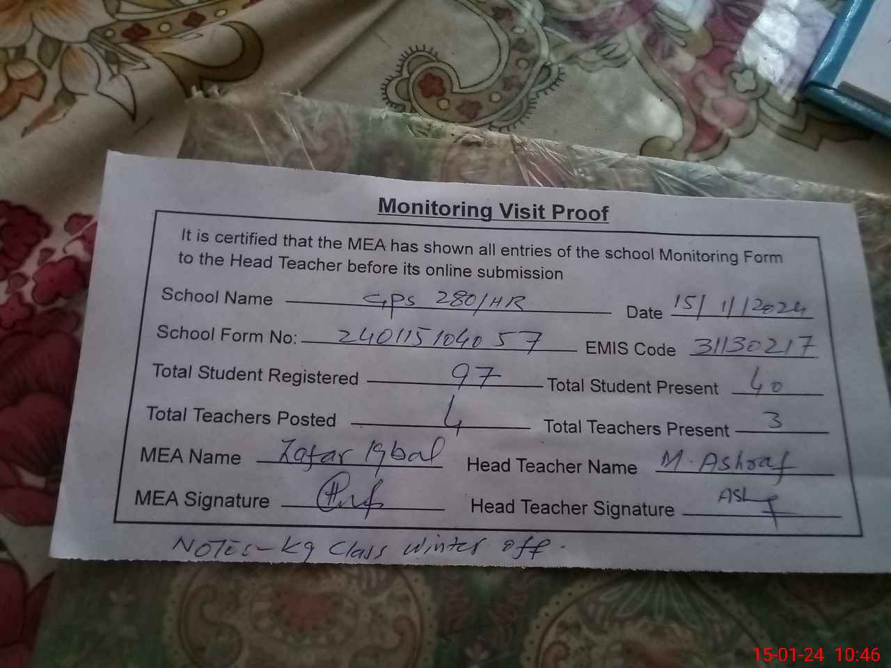 | EMIS Code: 31130217 | Name of School: GPS CHAK NO 280 HR | |||