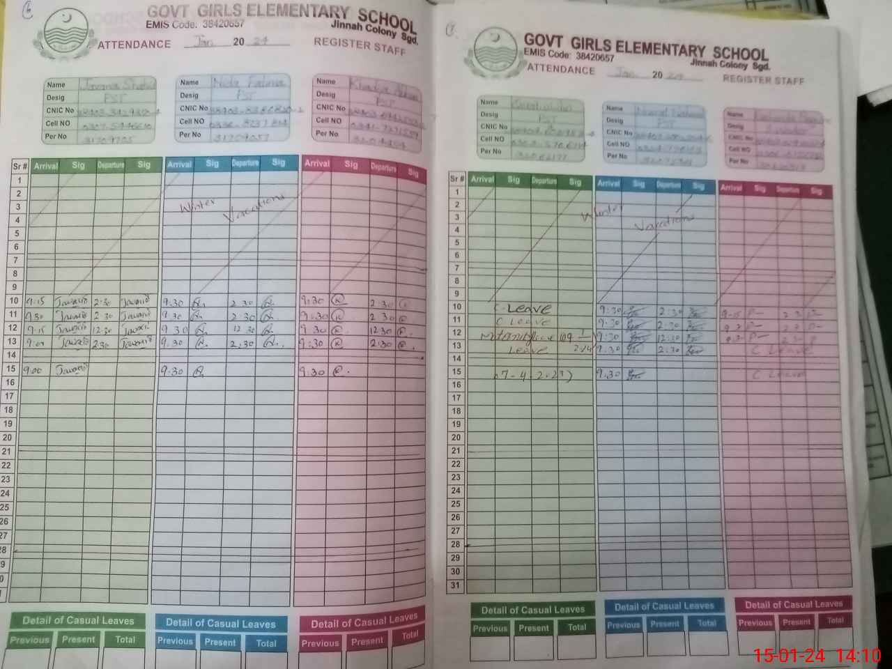 | CNIC | Full Name | Designation | R/C | Absence During Last Calender Month |