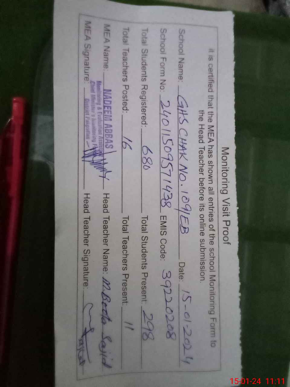 | EMIS Code: 39220208 | Name of School: GHS CHAK NO. 109/ EB | |||