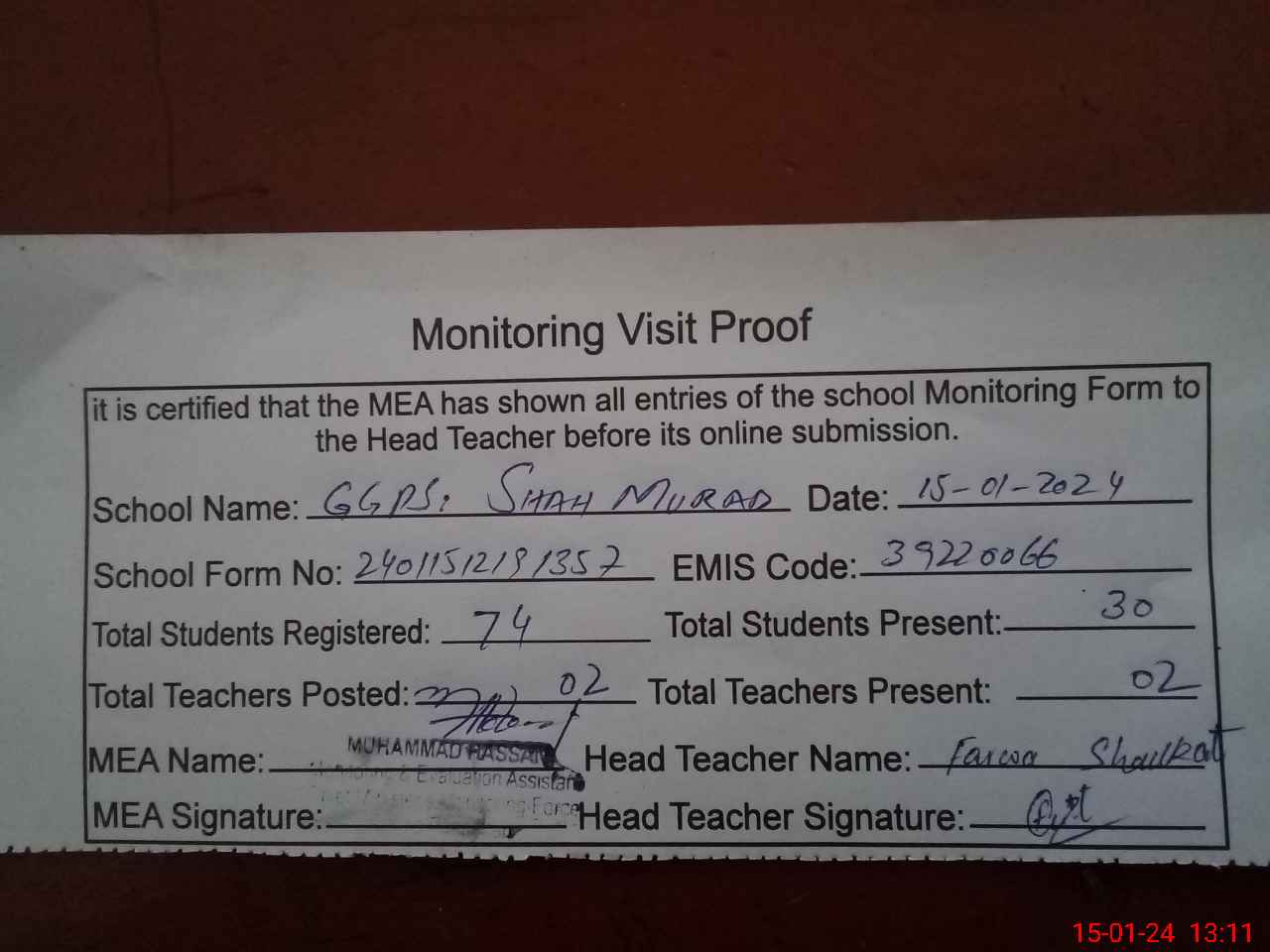 | Attendance Register | Head Teacher | MEA with School | Visit Proof |