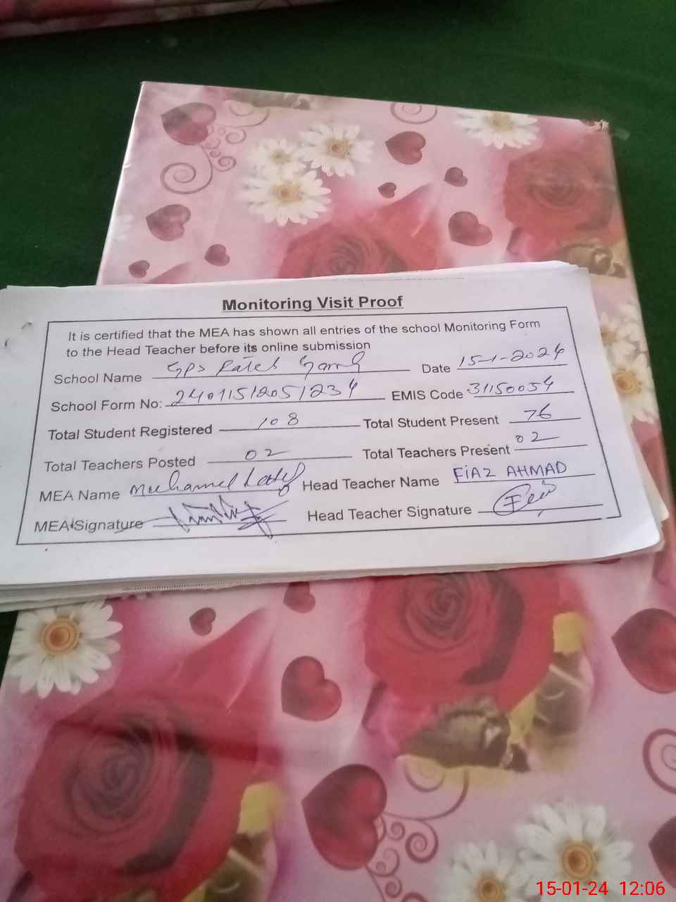| Attendance Register | Head Teacher | MEA with School | Visit Proof |