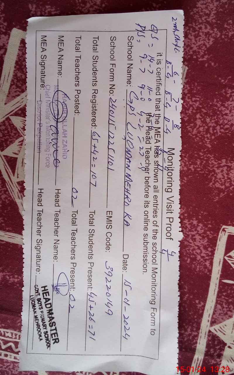 | EMIS Code: 39220149 | Name of School: GPS LUQMAN MEHRO KA | |||