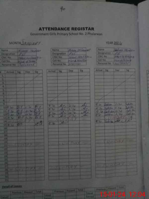 | CNIC | Full Name | Designation | R/C | Absence During Last Calender Month |