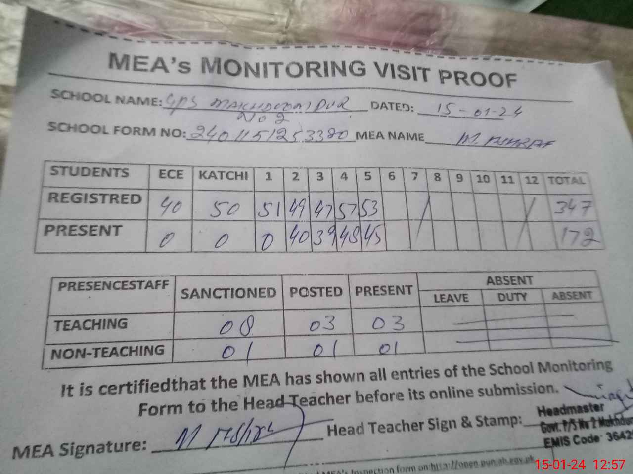 | Attendance Register | Head Teacher | MEA with School | Visit Proof |