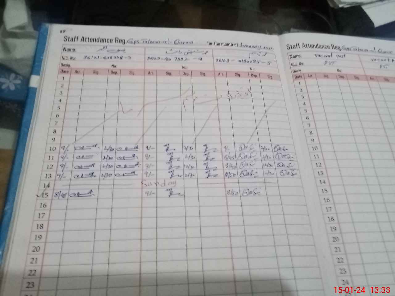 | CNIC | Full Name | Designation | R/C | Absence during last cal. month |