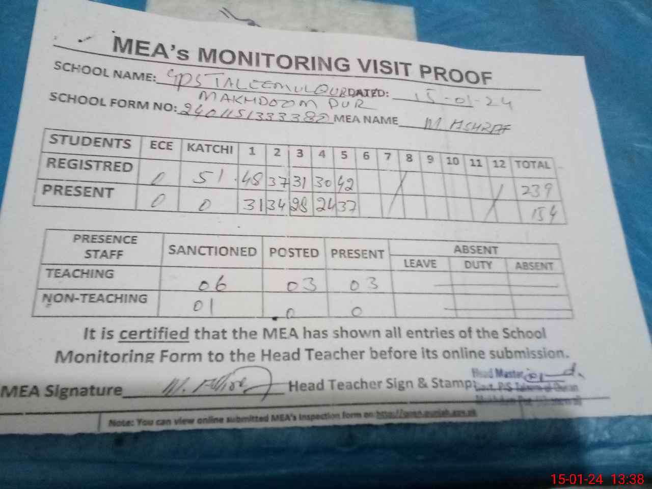 | Attendance Register | Head Teacher | MEA with School | Visit Proof |