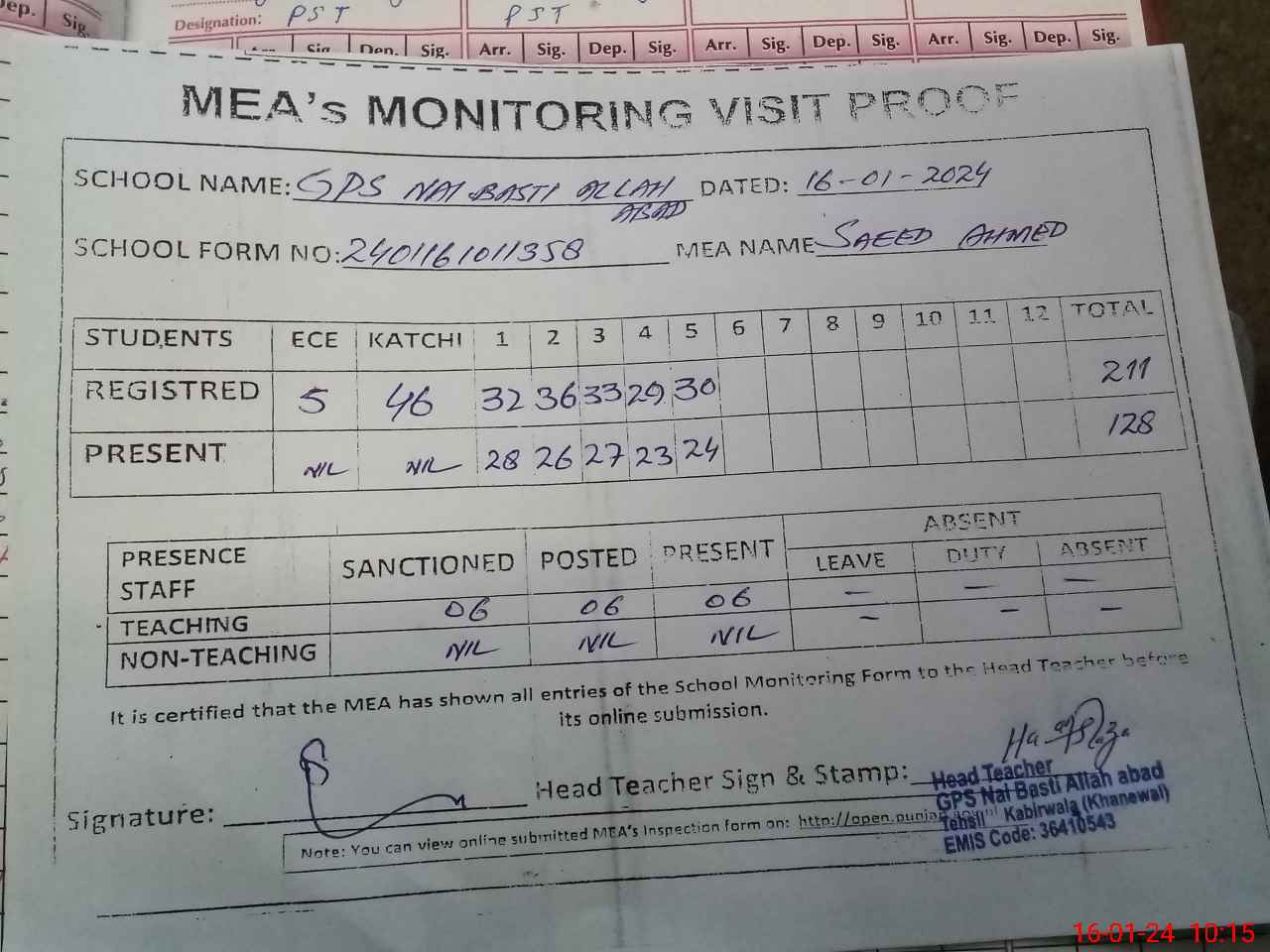 | Attendance Register | Head Teacher | MEA with School | Visit Proof |