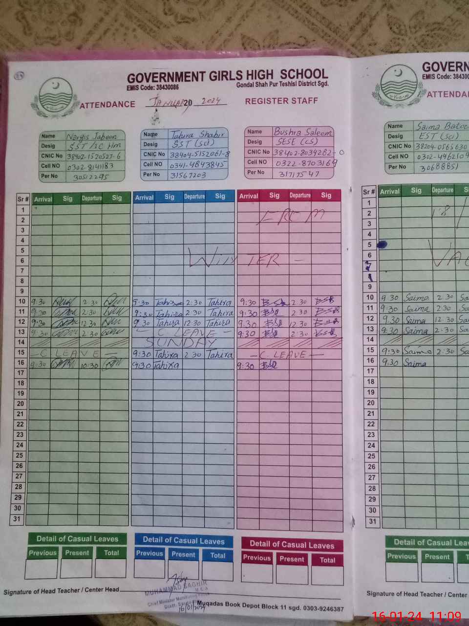 | CNIC | Full Name | Designation | R/C | Absence during last cal. month |
