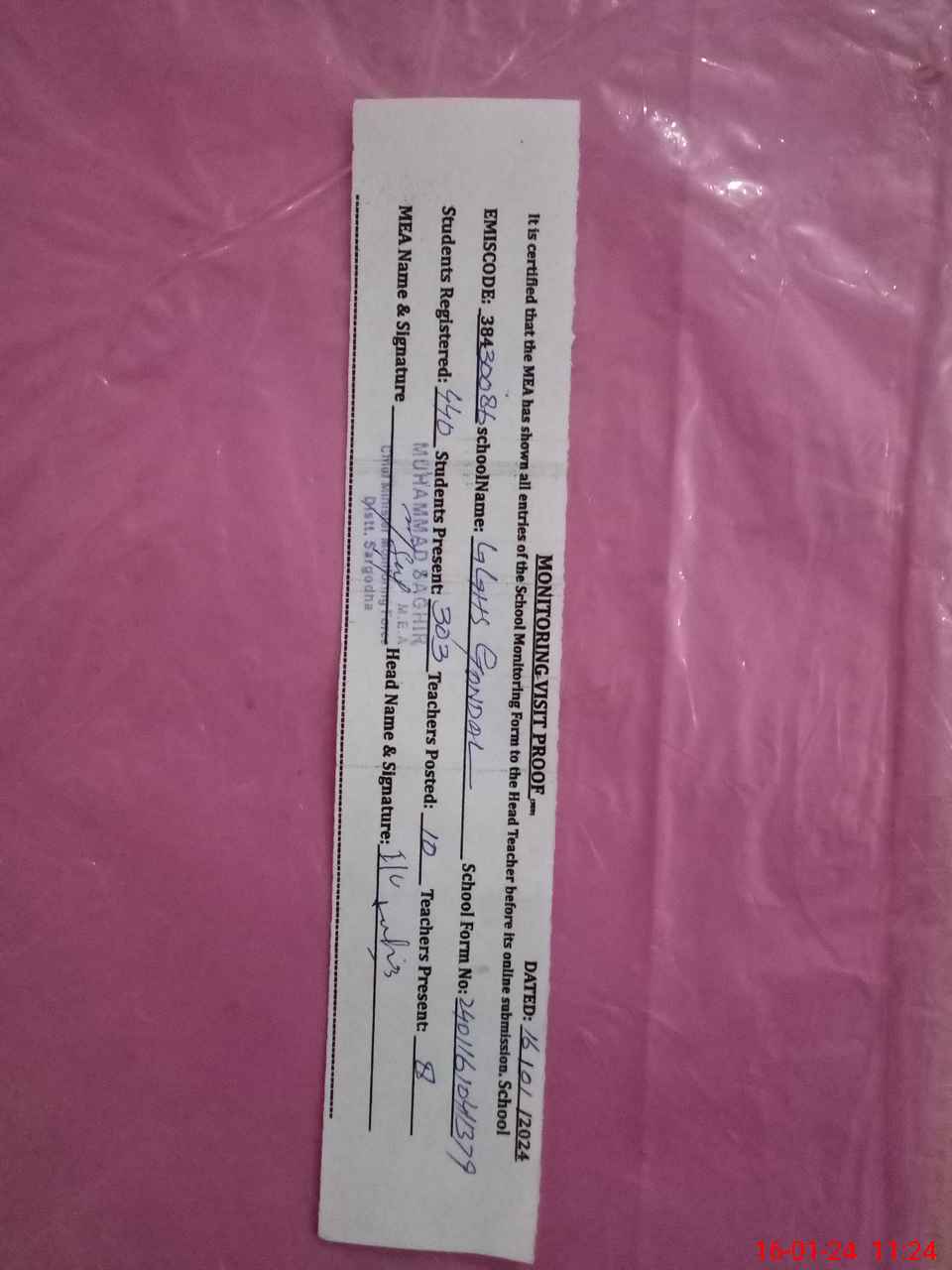 | Certified that this School was Inspected by the Undersigned MEA/DMO Today and the Information Stated Above is as Per Record. | |||||