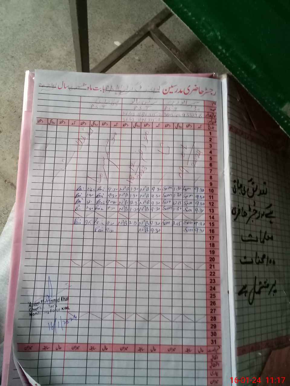 | CNIC | Full Name | Designation | R/C | Absence During Last Calender Month |