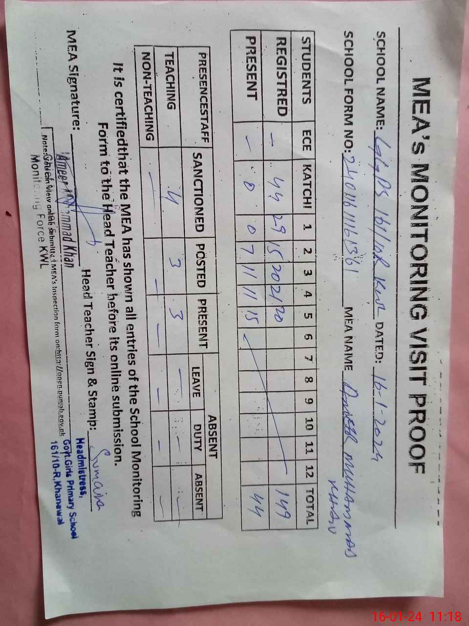 | Attendance Register | Head Teacher | MEA with School | Visit Proof |