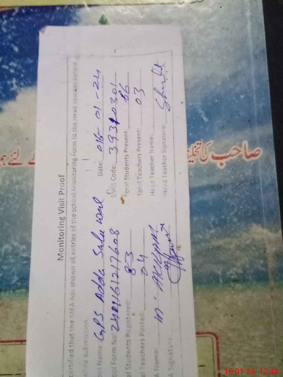 | Name: Sh**** Al**** Wa**** Designation: (School Headmaster's/Headmistress's) PTC/JV Phone/Cell Number: 03**** |