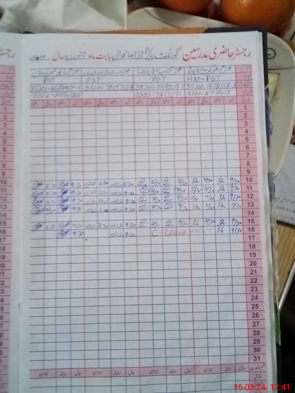 | CNIC | Full Name | Designation | R/C | Absence During Last Calender Month |