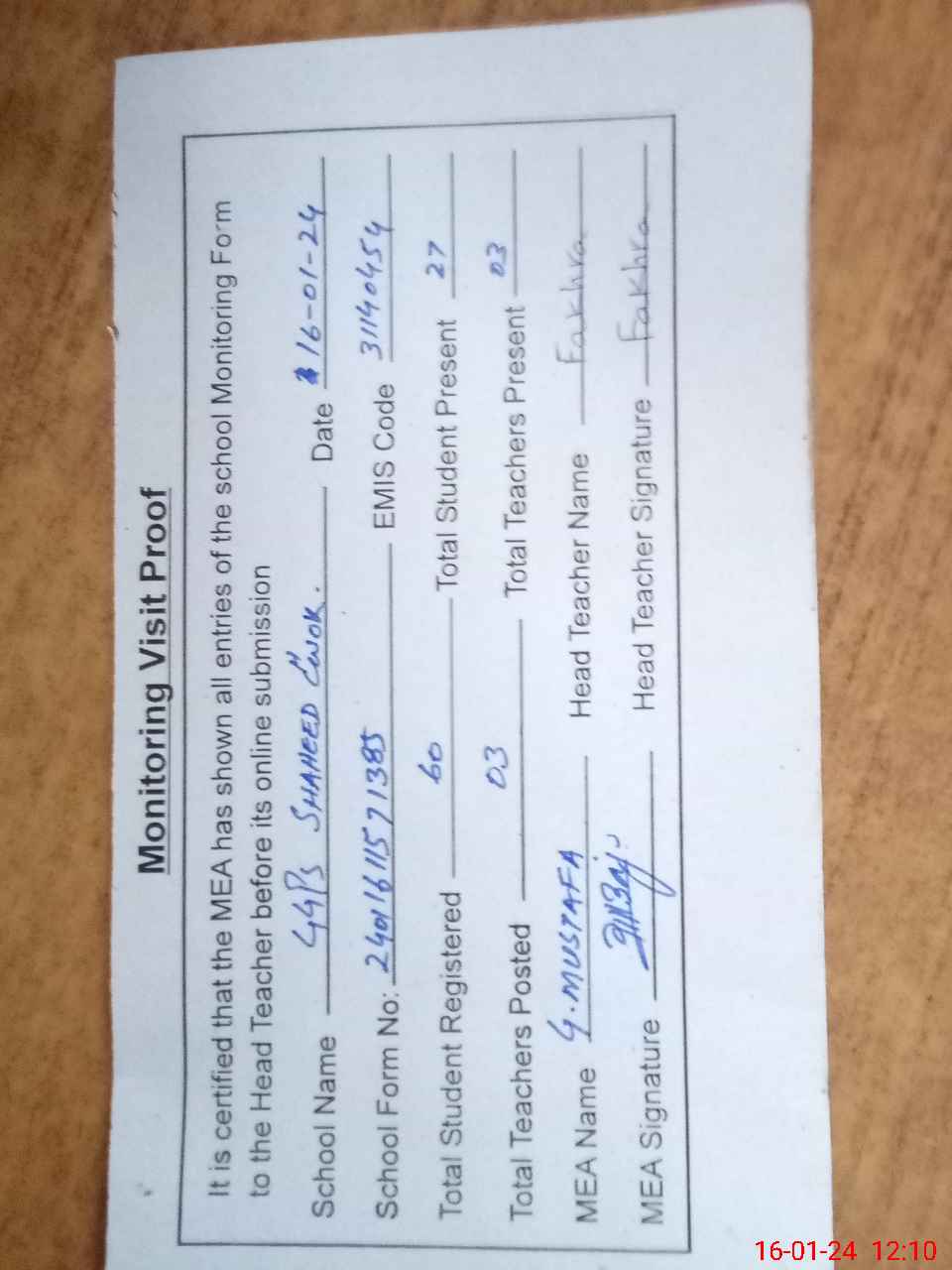 | EMIS Code: 31140454 | Name of School: GGPS CHOWK SHAHEED | |||