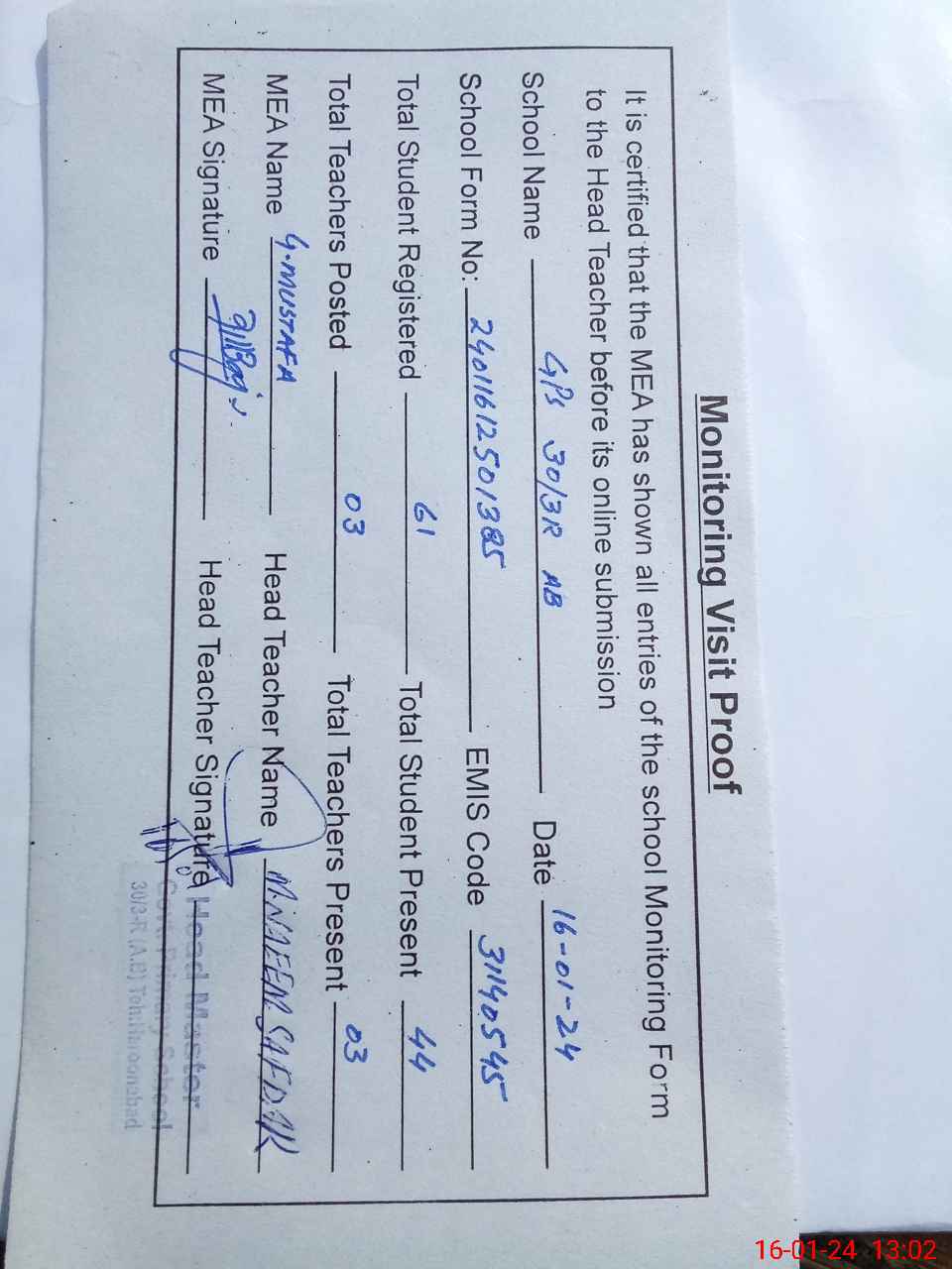 | Attendance Register | Head Teacher | MEA with School | Visit Proof |