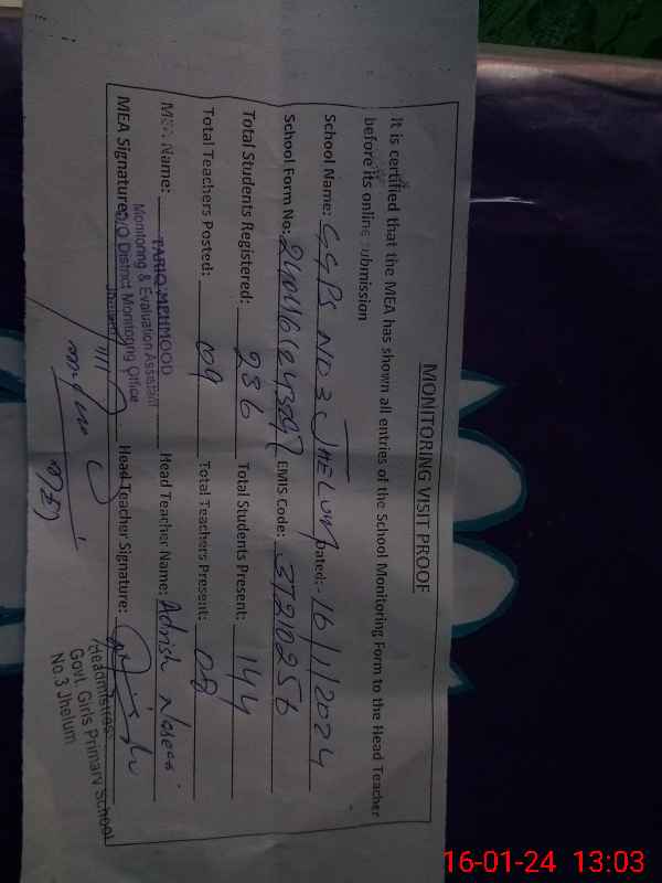 | EMIS Code: 37210256 | Name of School: GGPS NO. 3 JEHLUM | |||