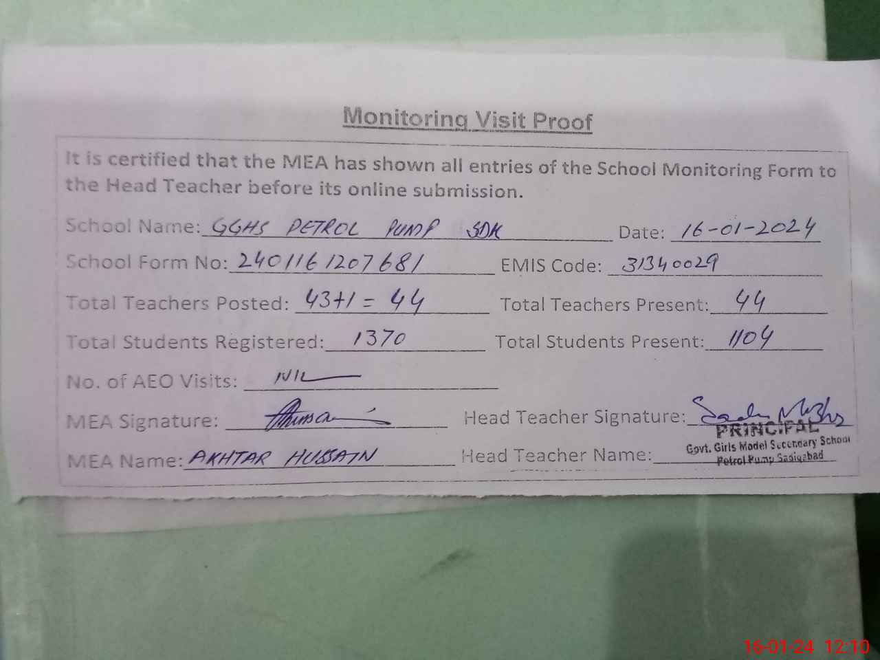 | Attendance Register | Head Teacher | MEA with School | Visit Proof |