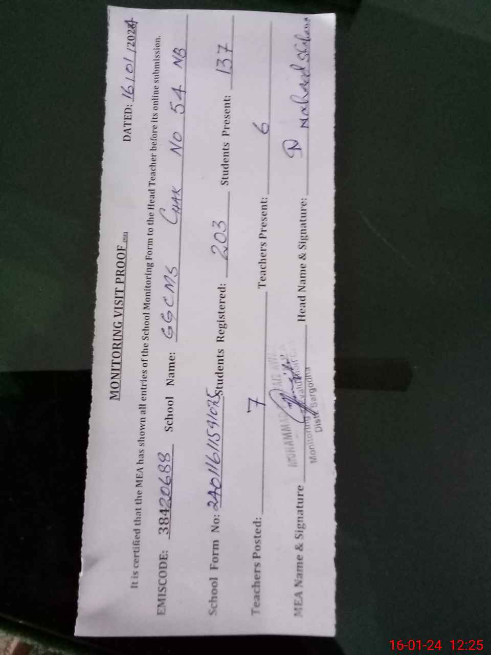 | Attendance Register | Head Teacher | MEA with School | Visit Proof |