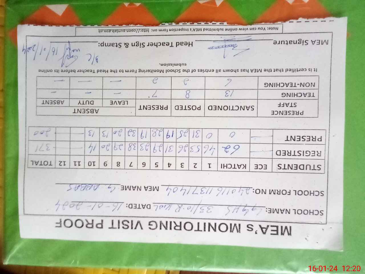 | Attendance Register | Head Teacher | MEA with School | Visit Proof |