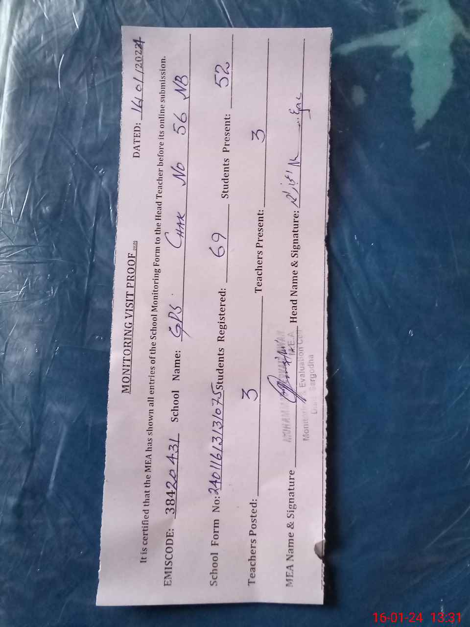 | Attendance Register | Head Teacher | MEA with School | Visit Proof |