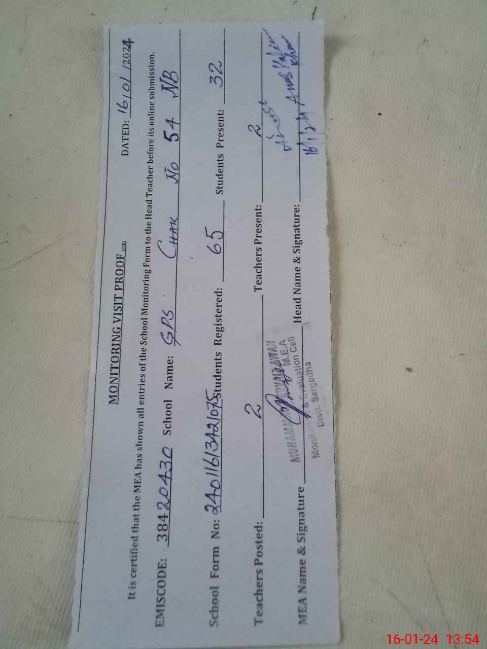 | Attendance Register | Head Teacher | MEA with School | Visit Proof |
