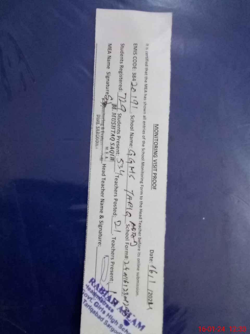 | Attendance Register | Head Teacher | MEA with School | Visit Proof |