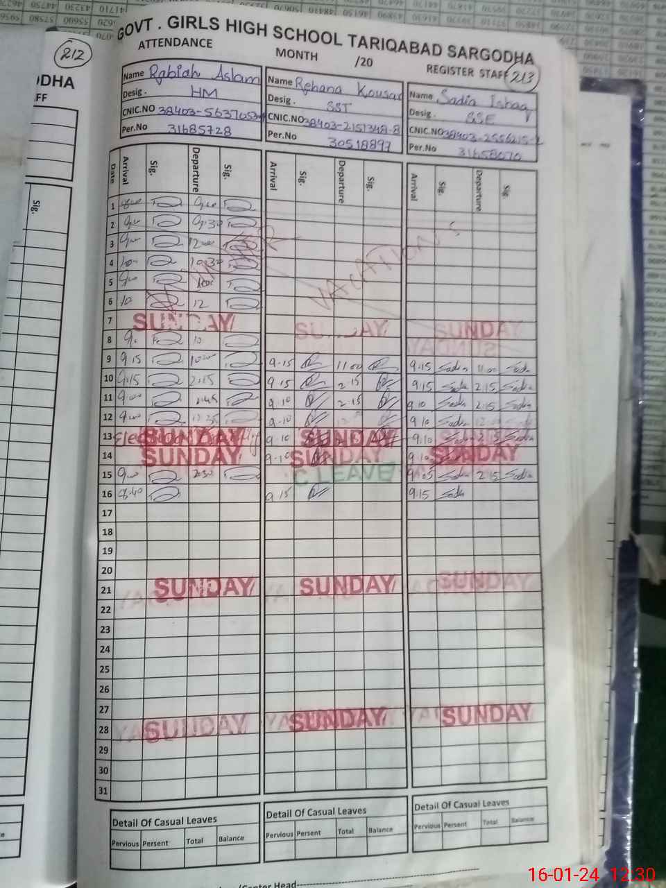 | CNIC | Full Name | Designation | R/C | Absence during last cal. month |