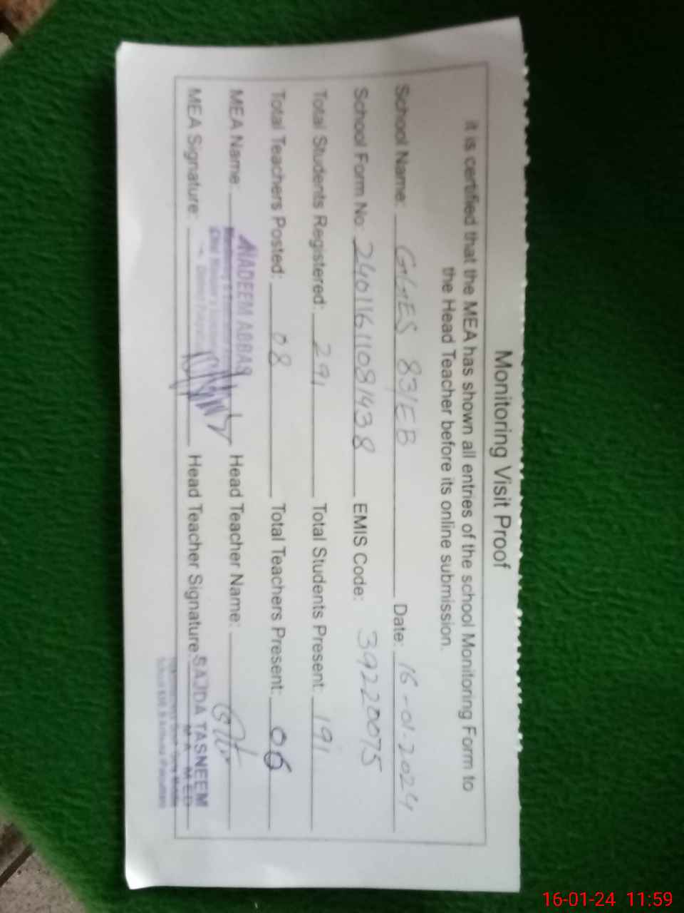 | Certified that this School was Inspected by the Undersigned MEA/DMO Today and the Information Stated Above is as Per Record. | |||||