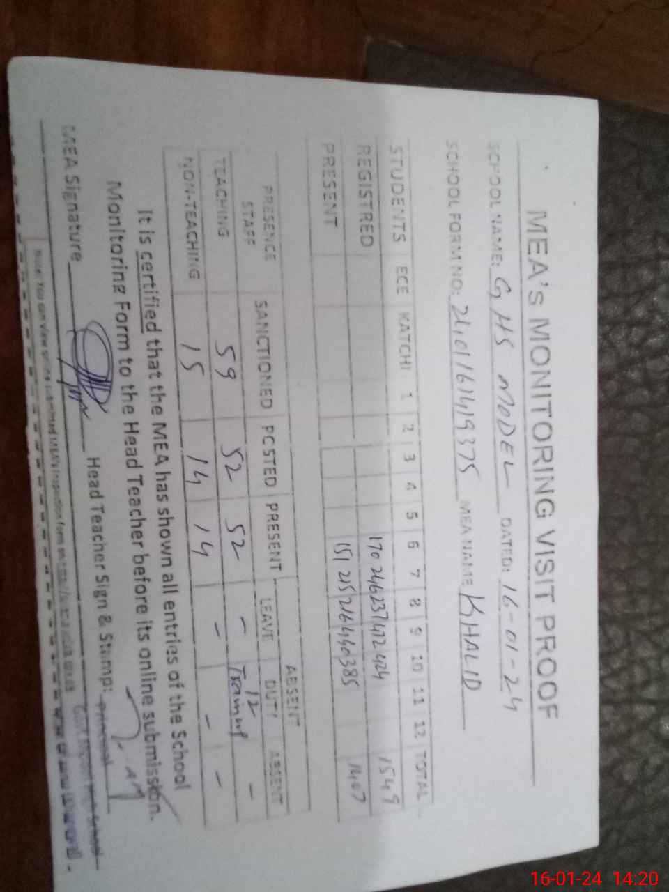 | Attendance Register | Head Teacher | MEA with School | Visit Proof |