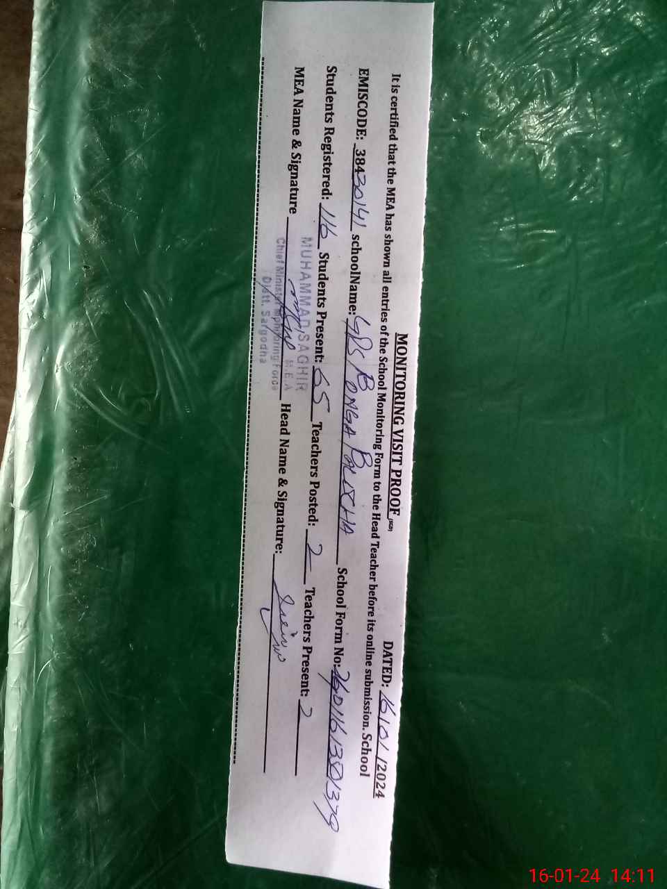 | Certified that this School was Inspected by the Undersigned MEA/DMO Today and the Information Stated Above is as Per Record. | |||||