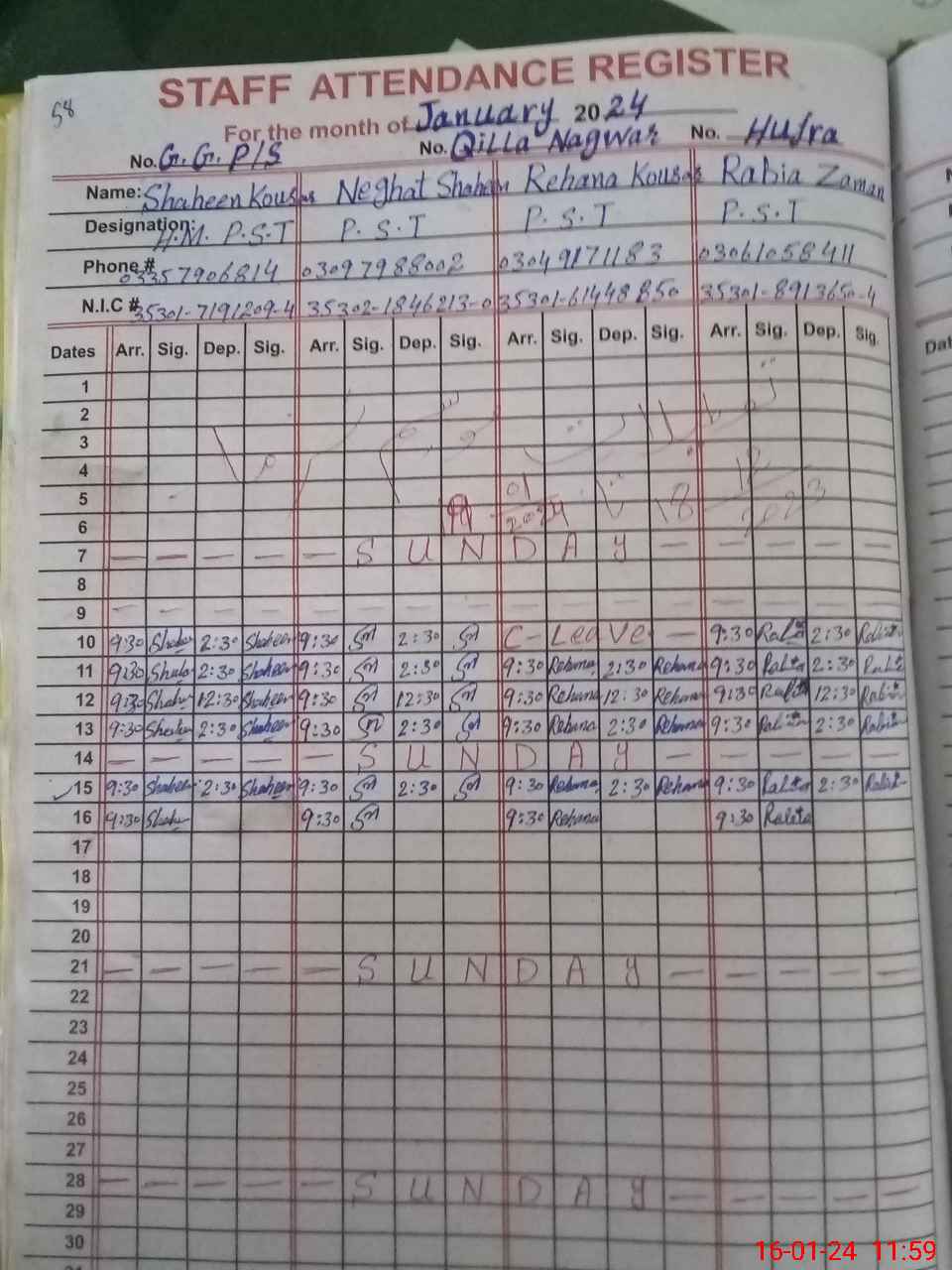 | CNIC | Full Name | Designation | R/C | Absence during last cal. month |