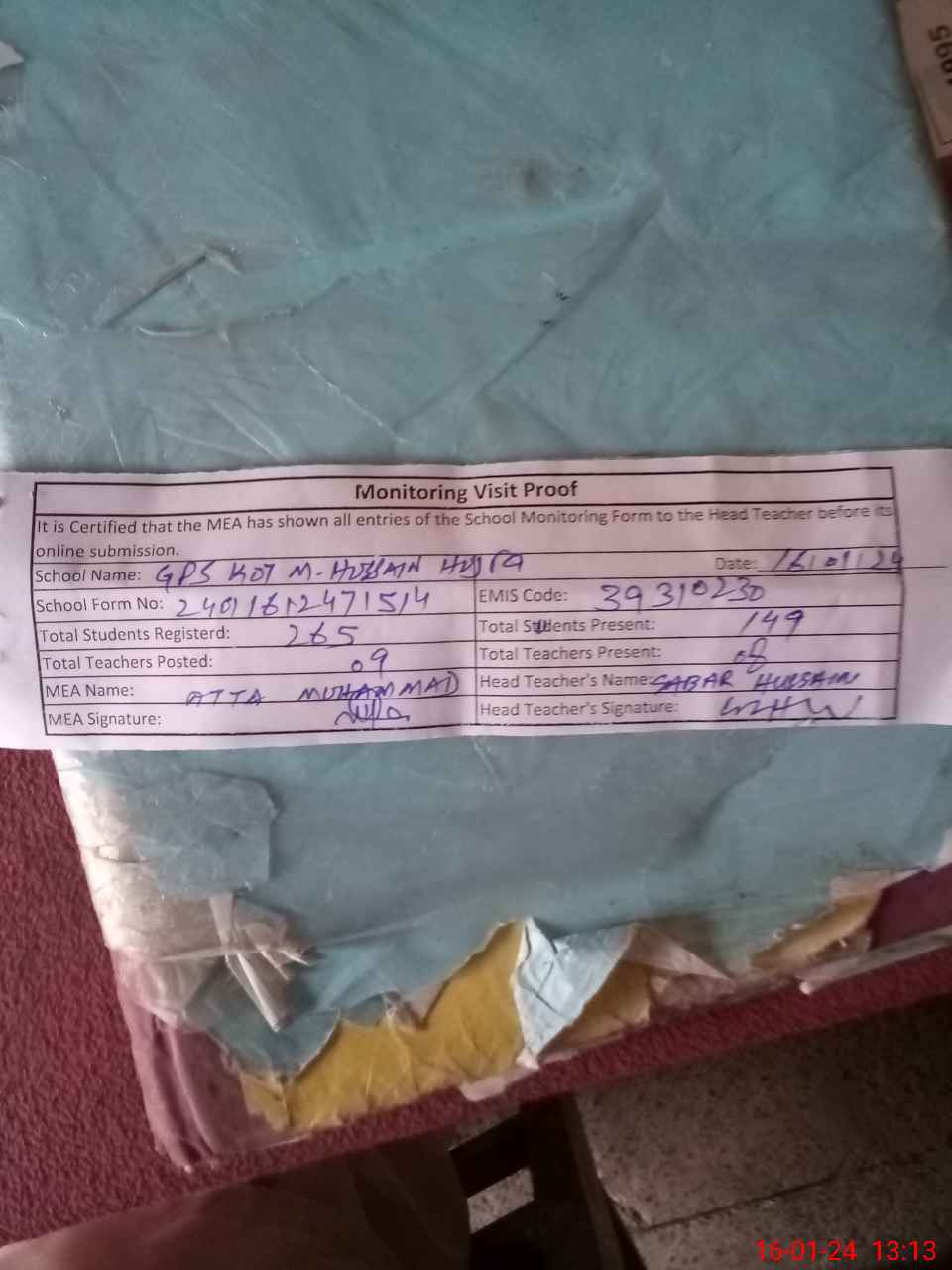 | Attendance Register | Head Teacher | MEA with School | Visit Proof |