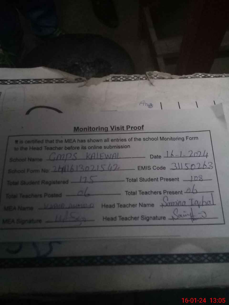 | Attendance Register | Head Teacher | MEA with School | Visit Proof |